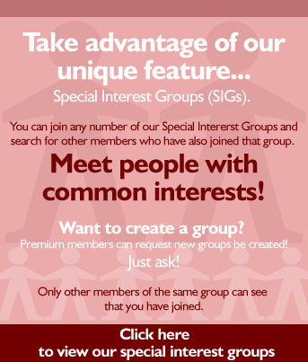 Join Special Interest Groups! (SIGs) When you join up you can select any number of groups that may interest you. You can even request a group be added for free. When others join the same group(s) you have joined you can base your searches on that group. For example if you join the “Democrats” group you can search for other people who joined that group. There are many groups in various categories including Vocation, Politics, Adult Interests, Activities, Organizations etc.